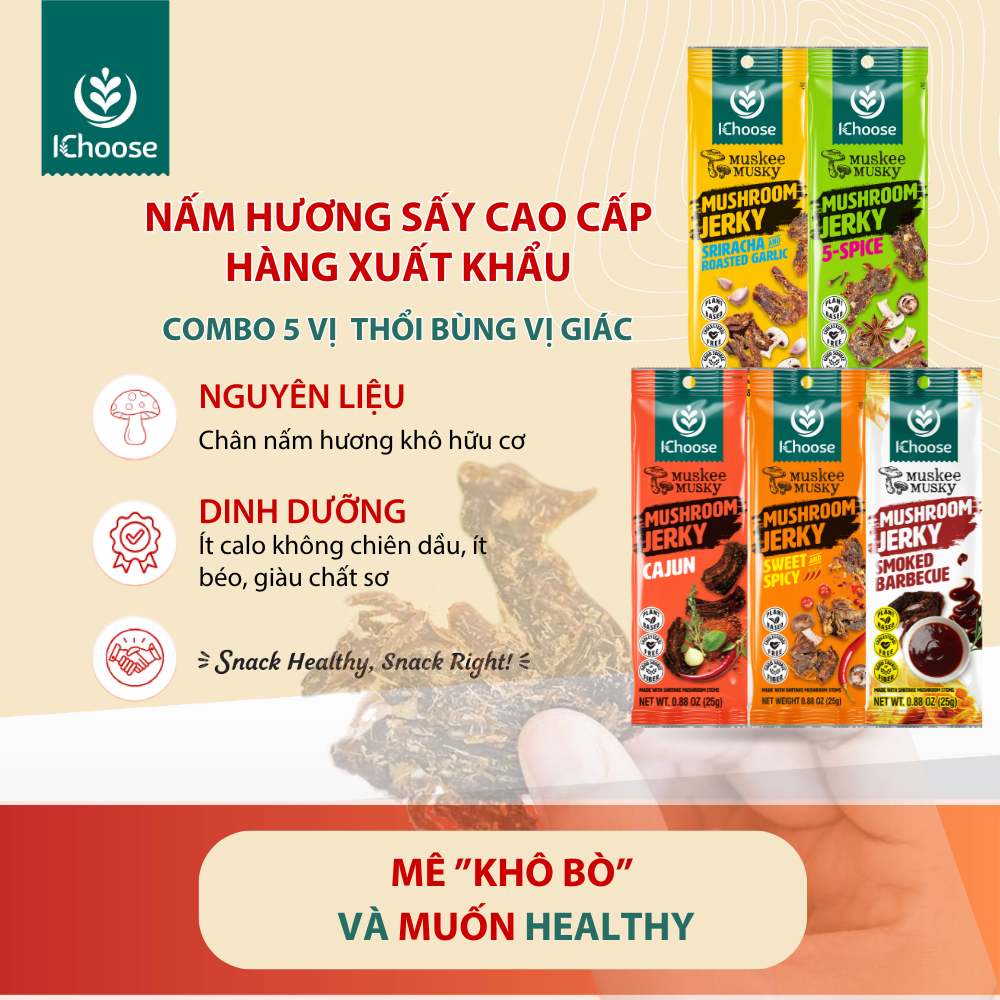 ⭐️ COMBO MIX 5 VỊ nấm sấy giúp bạn trải nghiệm vị Ngọt Umami tự nhiên từ nấm hương hòa quyện văn hóa ẩm thực Á Đông với các gia vị đặc trưng từ Sriracha trứ danh, vị cay của tỏi, ớt . Bạn cũng có thể thưởng thức vị thảo mộc cajun vùng Lousiana trứ danh hoặc vị barbecue xông khối đậm chất Âu Mỹ.